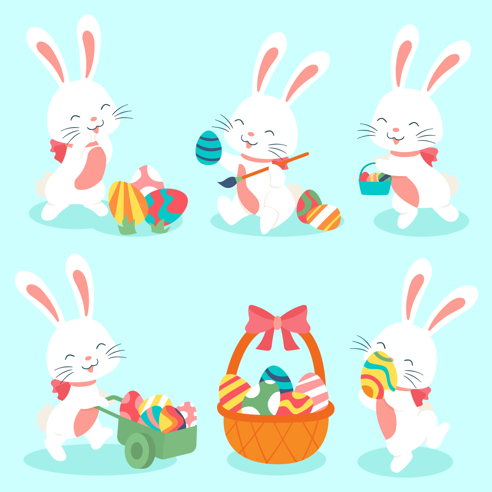根據民間傳說,復活節兔會在復活節前一天晚上,帶著一籃子裝飾過的雞蛋來到家裡。第二天,孩子們找到了這些彩蛋,然後開始慶祝節日。從復活節兔向量圖獲得靈感吧!